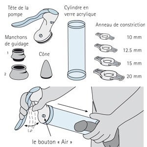 Le vacuum ou pompe manuelle permet de faire le vide autour du pénis et donc d’obtenir une érection, mécaniquement.
